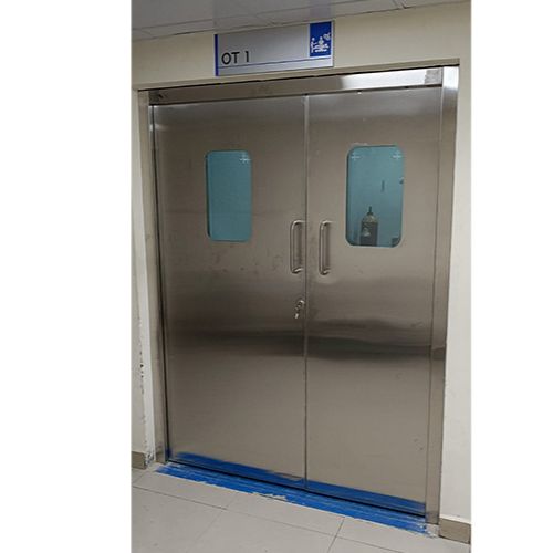 Swing or sliding door with 40 to 45 mm made of SS Sheet thick door leaf and door leaf filled with puf as infill , vision float glass 5 mm thick having minimum size 300 mm width x 500 mm height with matching clean room door powder coated as per Approver colour. Door rail with protection bush on the bottom along with SS-D handle on both the side stopper on opening and closing & view panel. Leaf thick 0.8mm rail thick : 1.2 mm infill puf.